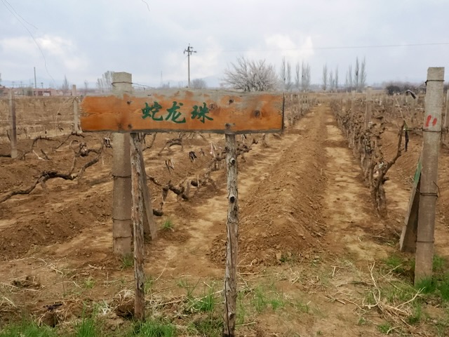 葡萄は現在発芽の時期(4月20日頃)でした。コルドンロワイヤの垣根仕立てです。こちらの栽培面積は約200ムー(約13ha)ですが、年間生産量は5千~6千トン(約400万本と推定)とのことですので契約農家から仕入れているようです。規模としては中規模から大規模の範疇に入るとのコメントでした。
