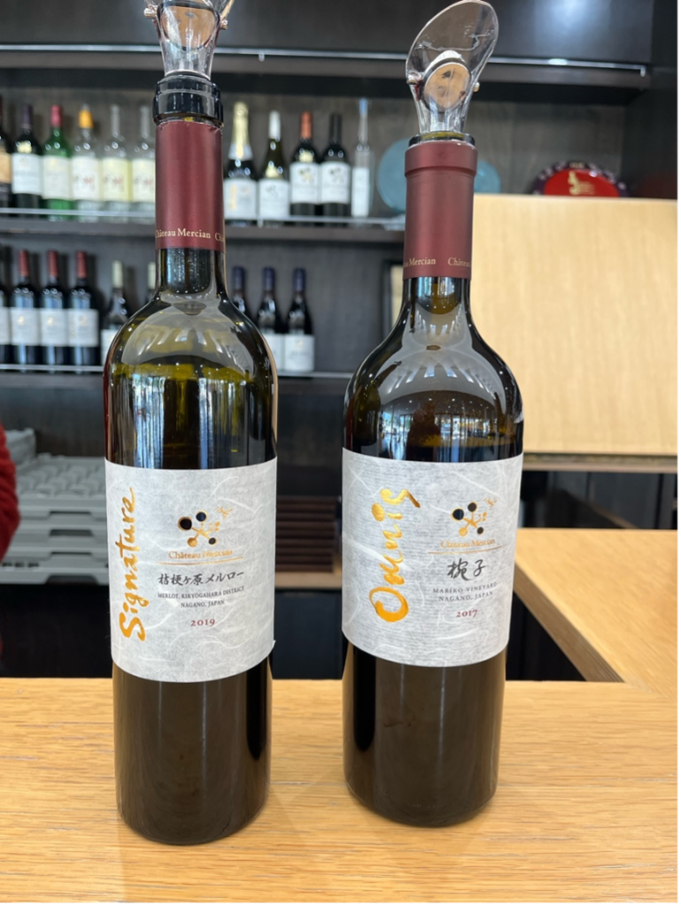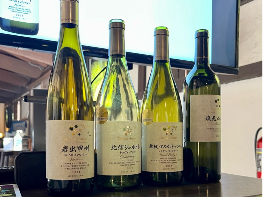 テイスティングワインはすべて5000円から6000円の価格帯のものです。柑橘の香りが中心の甲州、バニラ、ココナッツ香と青リンゴなどの爽やかさがあるシャルドネ、イチゴなどのベリー香でチャーミングなマスカットベリーA、メルローで名を挙げた塩尻地区産で酸味とタンニンのバランスがよいメルローです。