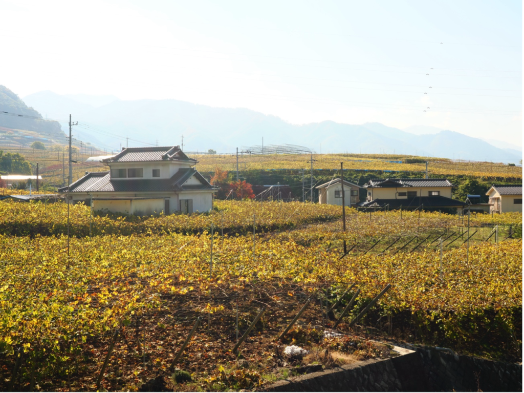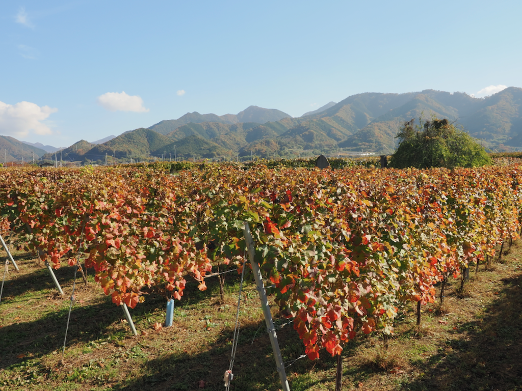 最寄駅は中央線の勝沼ぶどう郷駅です。タクシーで約8分と紹介されていましたがせっかくの紅葉の季節なので2.5kmの道のりを45分かけて歩いて向かいました。たくさんの紅葉したぶどう園がありとてもきれいでした。